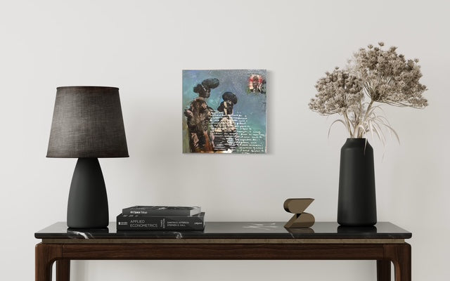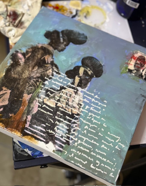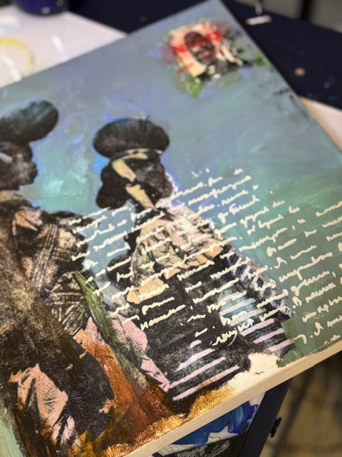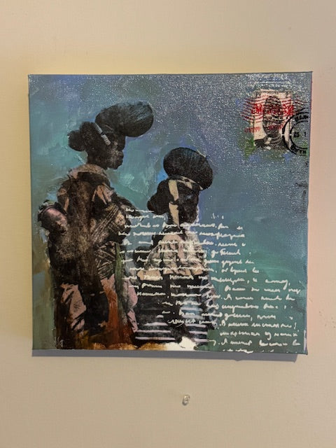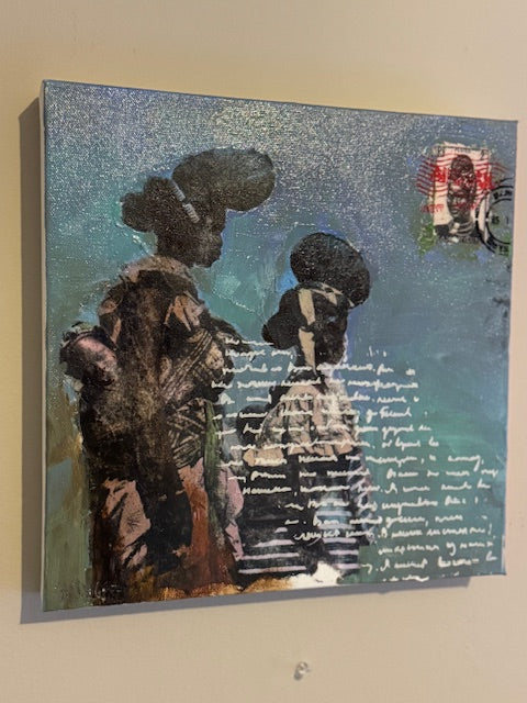"We Speak in Many Tongues" This piece captures the exchange of identity, culture, and story. The figures—cloaked in ancestral garments and shadowed in resilience—stand as living archives. The handwritten script flowing across their bodies symbolizes language as both spoken and unspoken: oral tradition, maternal wisdom, and ancestral echoes.