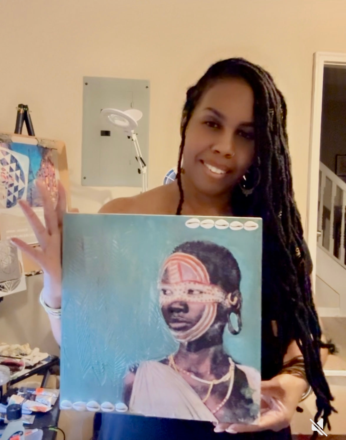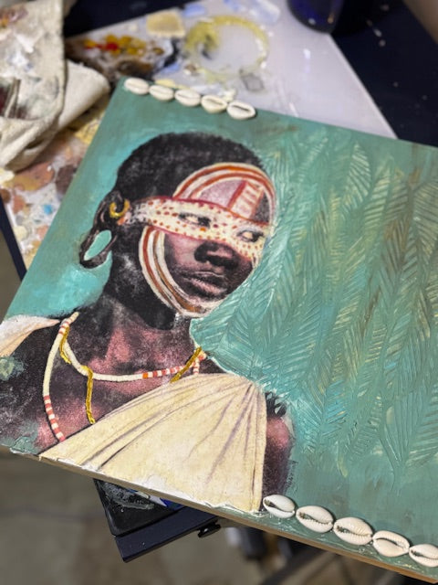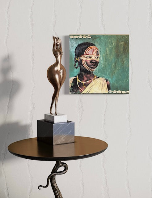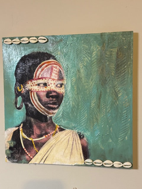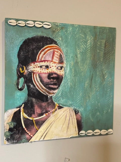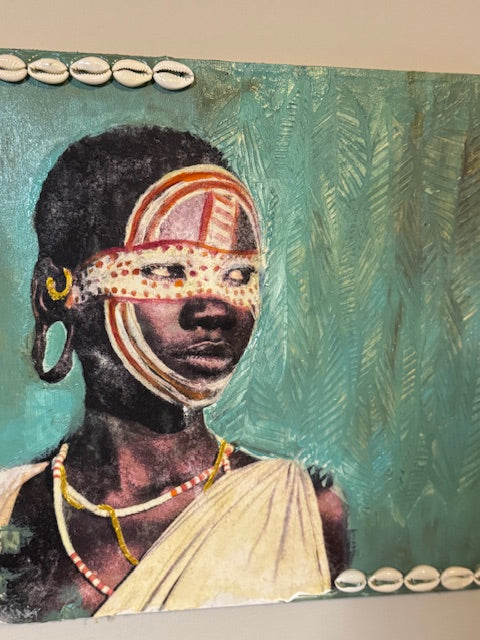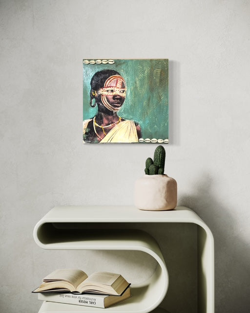 This portrait captures the enduring light within, even amidst silence and shadow. The woman stands adorned in ancestral paint, framed by cowrie shells—symbols of wealth, protection, and spiritual connection. Her gaze is strong, a reflection of resilience. The textured green background, marked by subtle natural patterns, evokes growth, healing, and the presence of life even in quiet places.